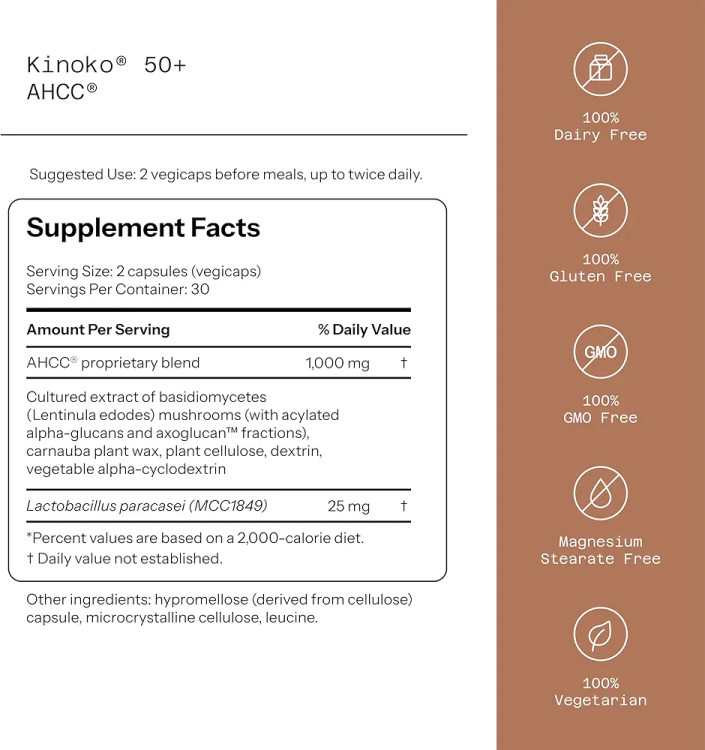 کپسول Kinoko 50+ AHCC with Sterilized Probiotics یک مکمل درمانی پیشرفته و علمی از برند آمریکایی Quality of Life است که با هدف تقویت سیستم ایمنی بدن و کمک به مقابله با ویروس HPV (زگیل تناسلی) طراحی شده است. این محصول با استفاده از ترکیب انحصاری AHCC® (Active Hexose Correlated Compound) که از نوعی قارچ دارویی ژاپنی استخراج میشود، توانایی بالایی در تحریک پاسخ ایمنی طبیعی بدن دارد و در تحقیقات بالینی نیز مورد بررسی و تأیید قرار گرفته است.