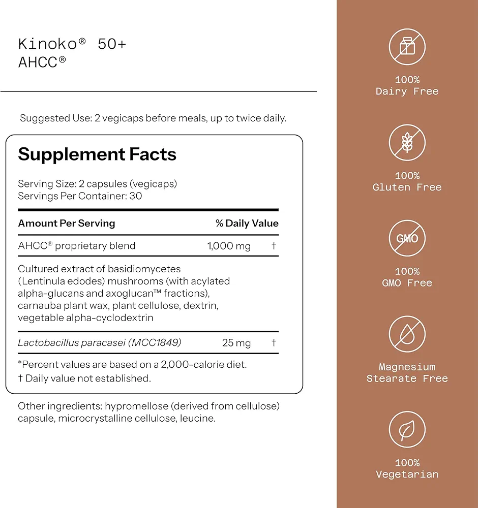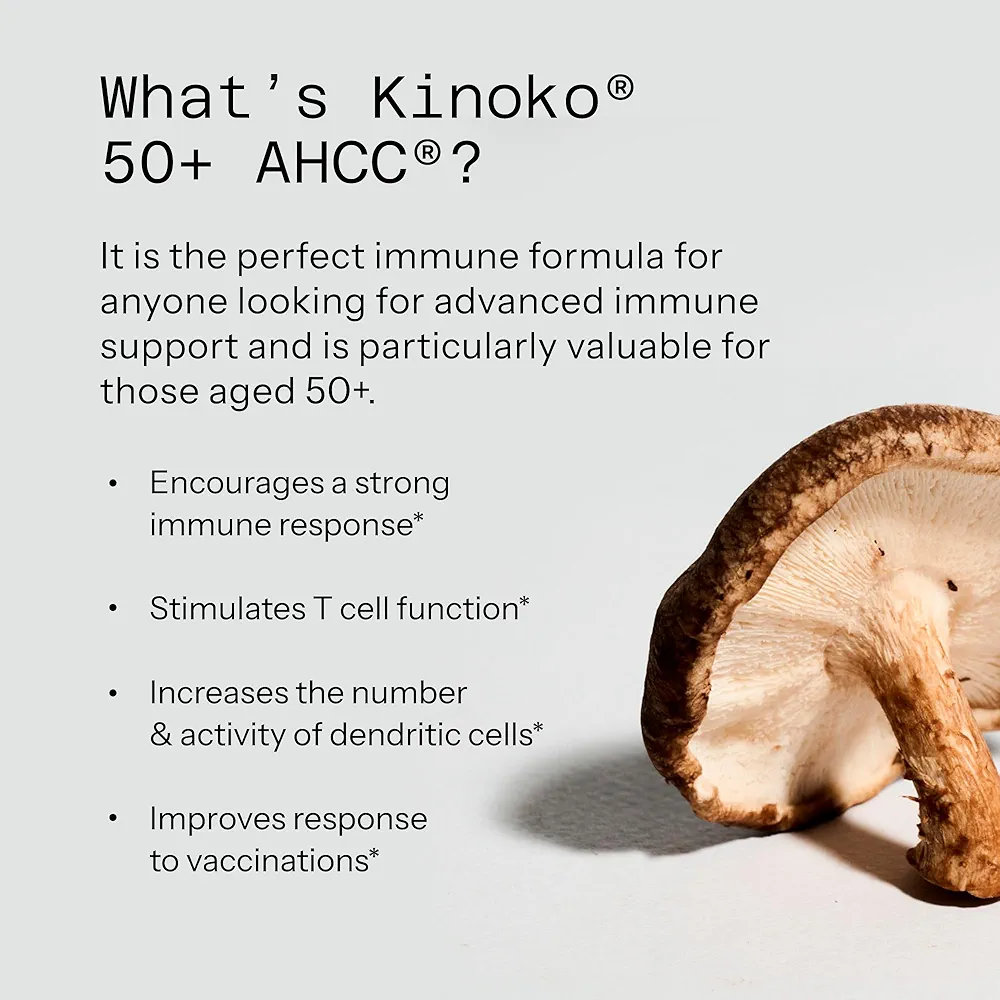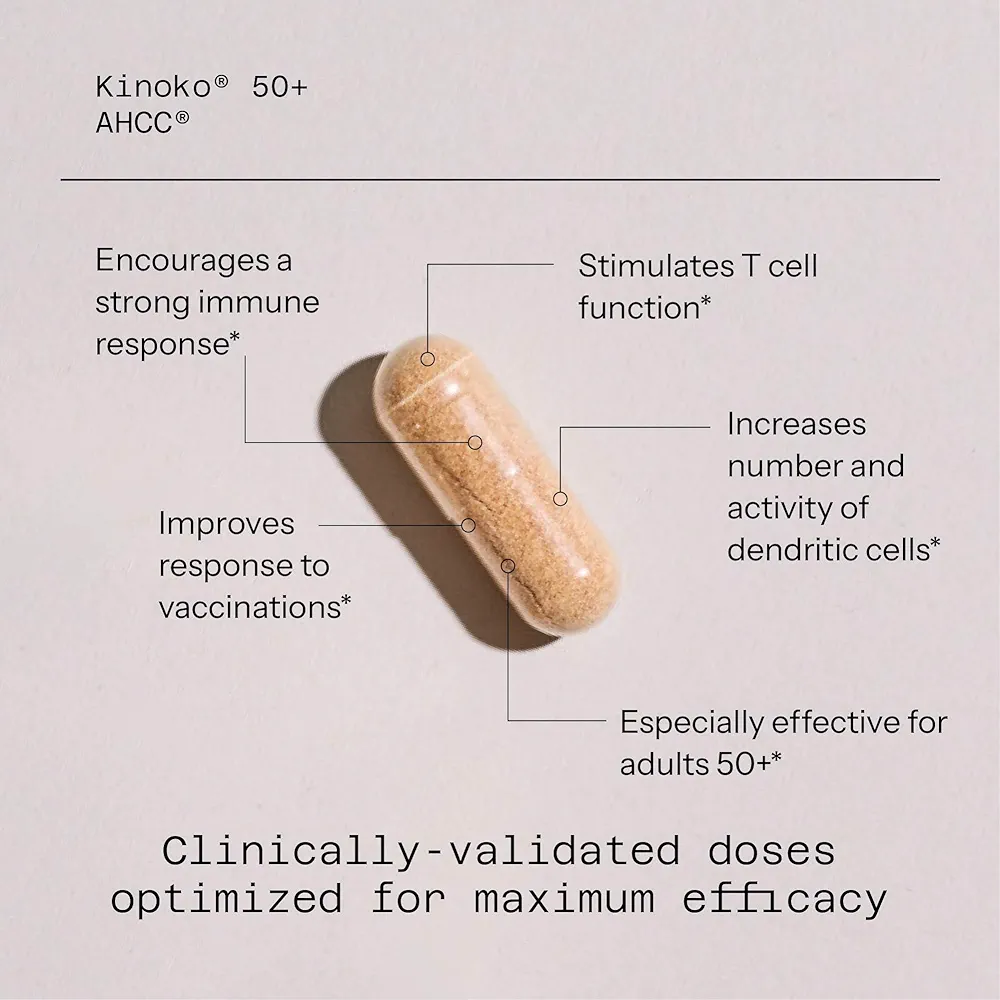 کپسول Kinoko 50+ AHCC with Sterilized Probiotics یک مکمل درمانی پیشرفته و علمی از برند آمریکایی Quality of Life است که با هدف تقویت سیستم ایمنی بدن و کمک به مقابله با ویروس HPV (زگیل تناسلی) طراحی شده است. این محصول با استفاده از ترکیب انحصاری AHCC® (Active Hexose Correlated Compound) که از نوعی قارچ دارویی ژاپنی استخراج میشود، توانایی بالایی در تحریک پاسخ ایمنی طبیعی بدن دارد و در تحقیقات بالینی نیز مورد بررسی و تأیید قرار گرفته است.