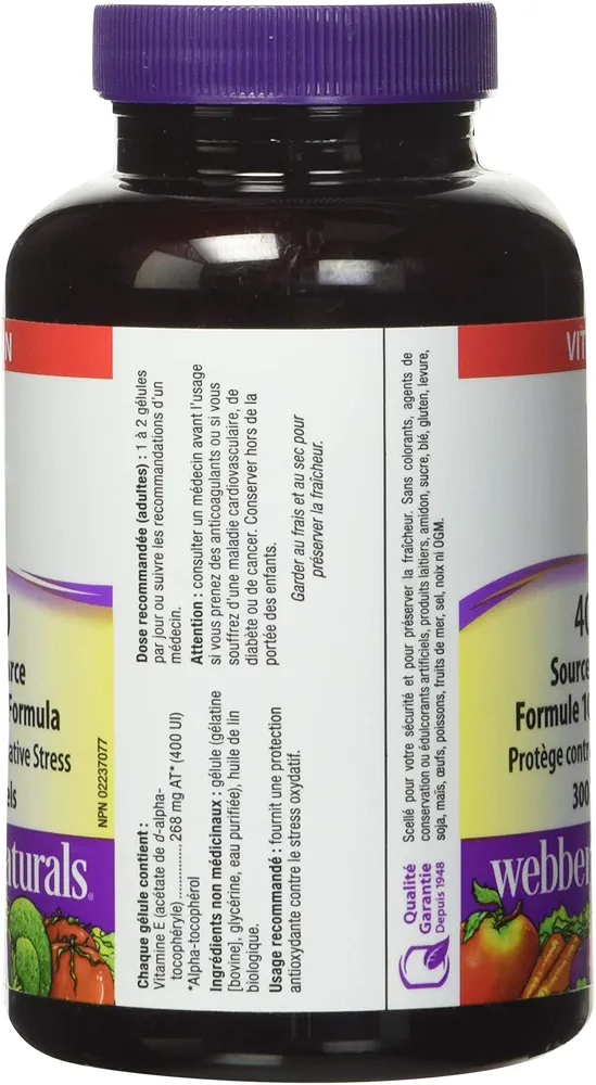 ویتامین E طبیعی 400 IU برند Webber Naturals یک مکمل غذایی با منبع طبیعی و کیفیت بالا است که برای پشتیبانی از سلامت عمومی بدن و محافظت از سلولها در برابر استرس اکسیداتیو طراحی شده است. ویتامین E به عنوان یک آنتیاکسیدان شناختهشده، در حفظ تعادل طبیعی بدن و حمایت از عملکرد سلولی نقش دارد.